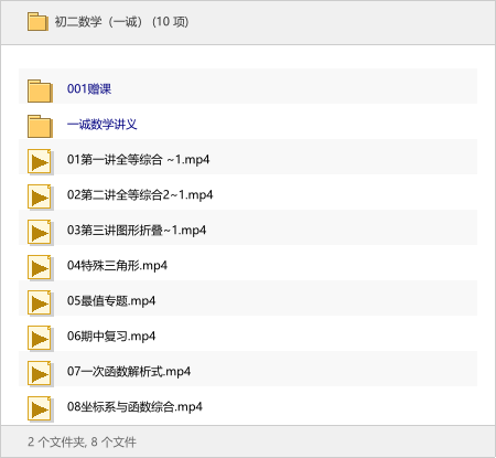 本次分享的资源是【初二数学(一诚)】,包含赠课、全套讲义以及从全等综合到函数综合的10节精讲视频。