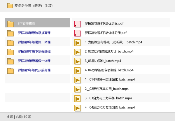 本次分享的资源是【罗振凌-物理(新版)】系列课程合辑,包含八年级到九年级的同步拔高、假期一体课等六个模块,覆盖了初中物理的核心提升阶段。