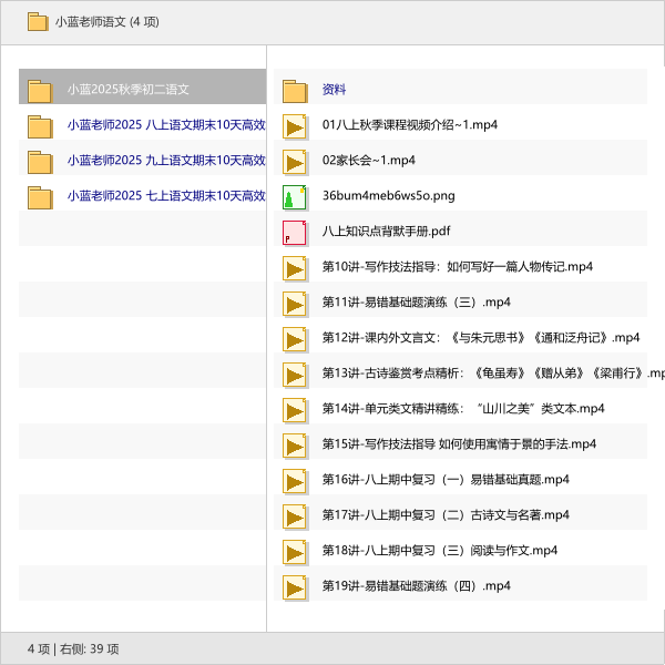 本次分享的资源是「小蓝老师语文」系列,包含了2025秋季初二语文同步课,以及七、八、九年级上册的期末10天高效复习专题。