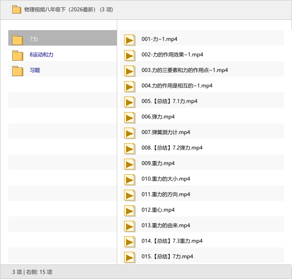本次分享的资源是《物理视频八年级下(2026最新)》,内容紧扣“力”与“运动和力”两大核心章节,并配有精选习题讲解。